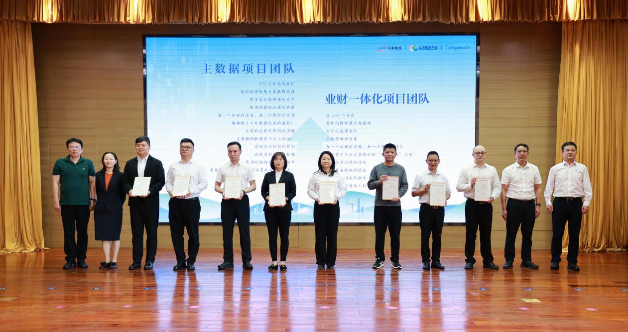上线仪式上,战略合作伙伴山东能源集团党委副书记、总经理周鸿,金蝶集团总裁章勇分别致辞,热烈祝贺项目成功上线,并表达深化战略协作、共建数字生态的坚定决心。能投集团总裁谢一华在致辞中深刻阐述项目对深化国企改革、提升治理效能的关键作用,对全体项目人员的辛勤付出给予了充分肯定。仪式设置表彰环节,能投集团、煤炭产业集团党委书记、董事长胡均等领导为贡献突出的12个核心团队代表颁发荣誉牌,集团财务总监沈军主持上线仪式并作项目说明。