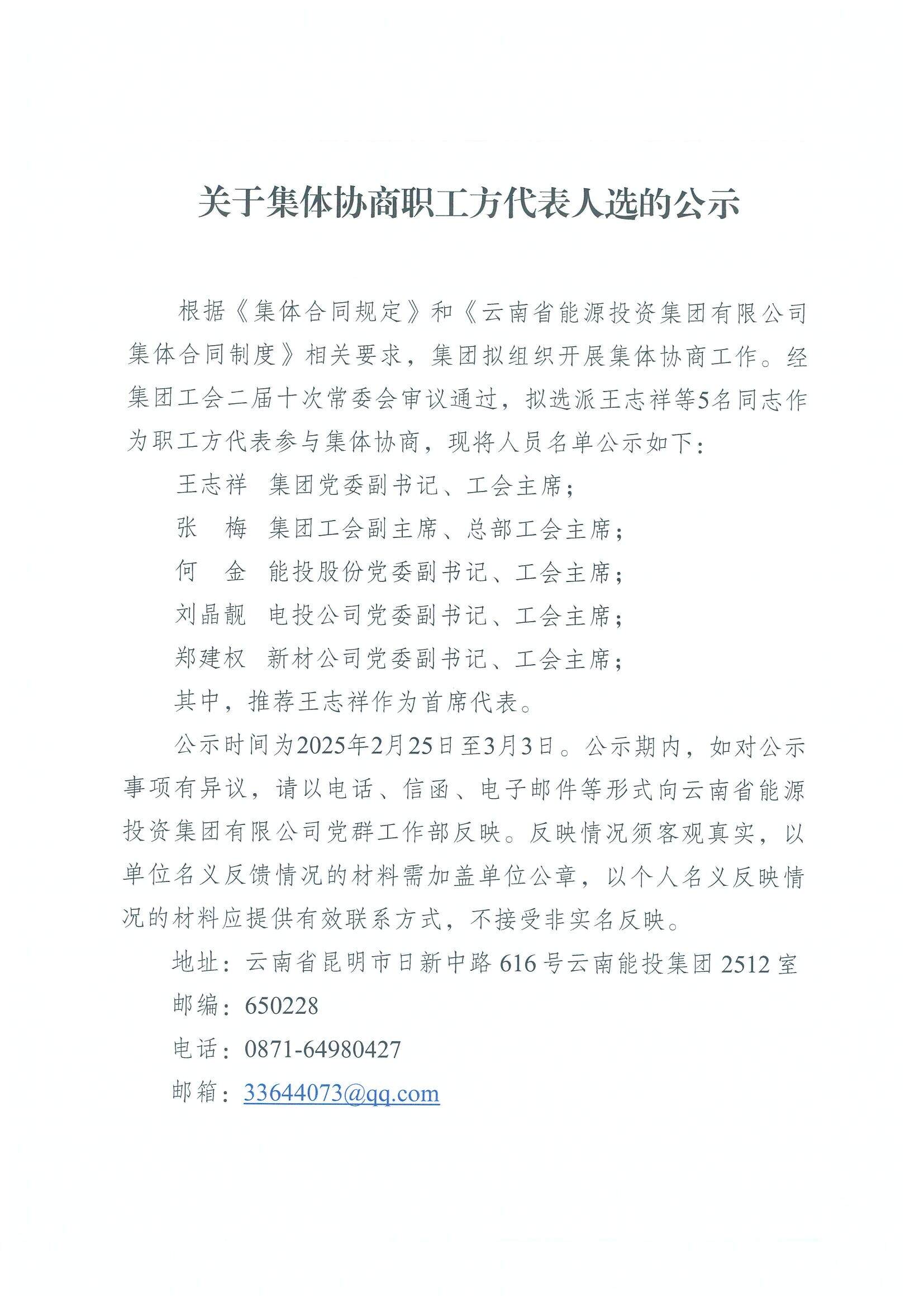 关于集体协商职工方代表人选的公示