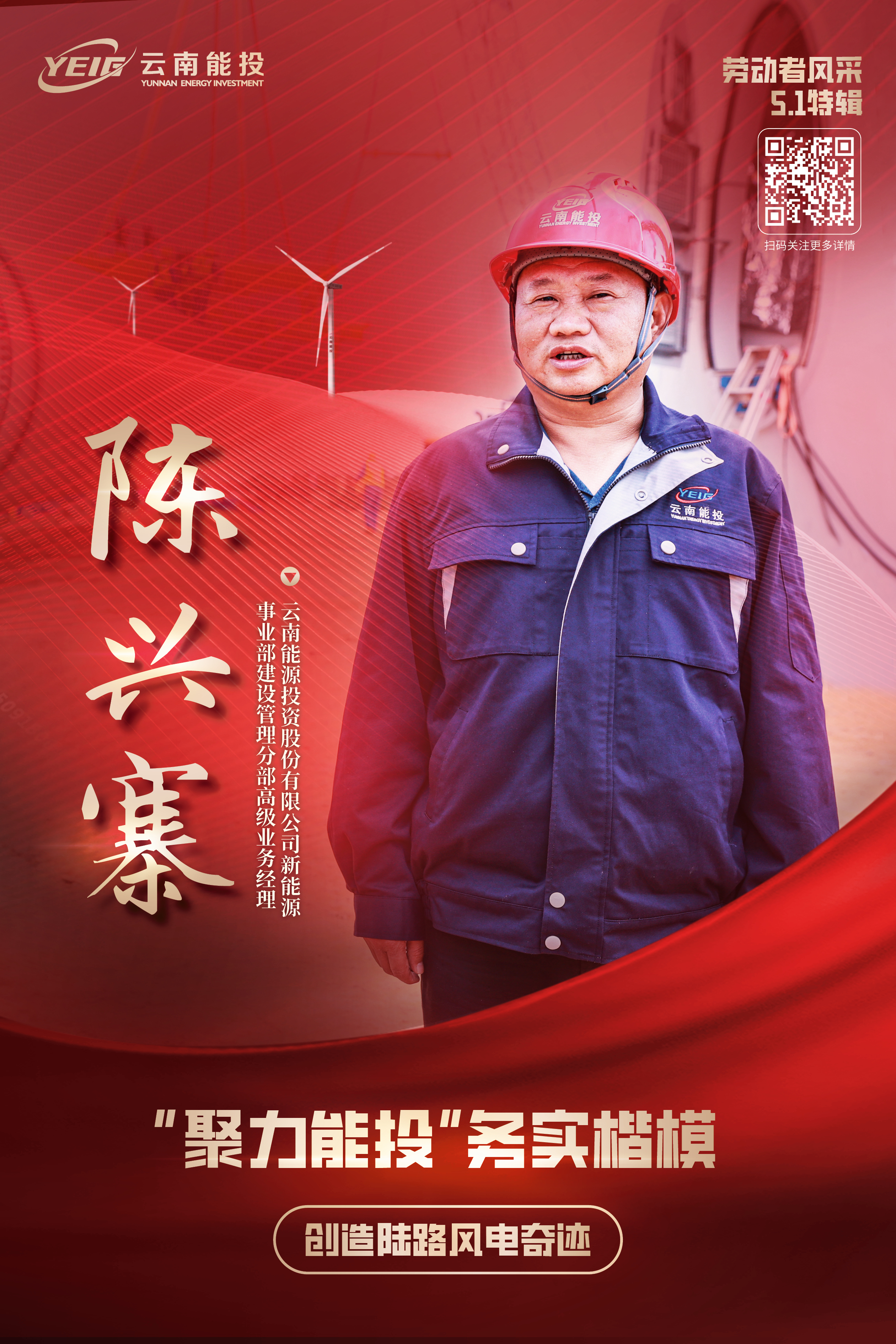 陈兴寨,男,中共党员,1974年5月生于云南保山,云南能源投资股份有限公司新能源事业部建设管理分部高级业务经理、高级工程师。他多年扎根基层,工作在最艰苦的地方,先后参与了云南省6个水电站,5个风电场建设。获得实用新型专利2项,发表科技论文2篇。进入云南能投集团工作以来,他2次被评为集团“聚力能投.务实楷模”,6次被评为集团优秀共产党员,1次被评为集团先进工作者。